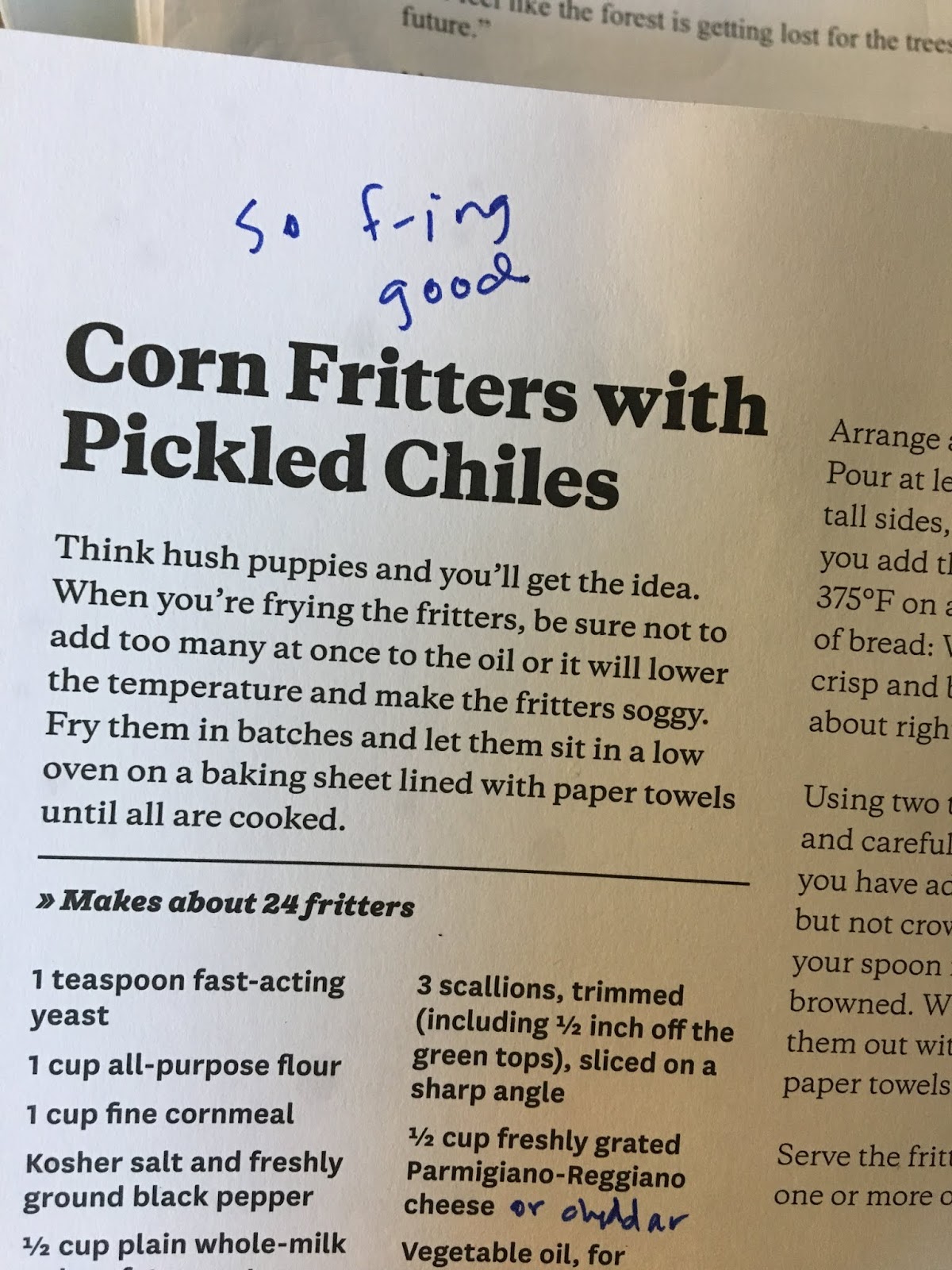 right now, is inspired by the “Corn Fritters with Pickled Chiles” in the marvelous